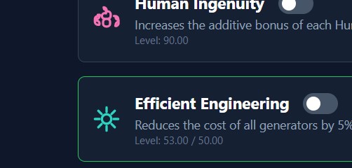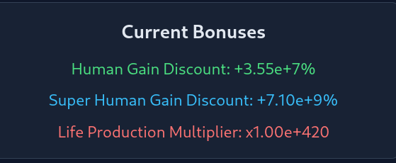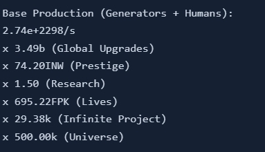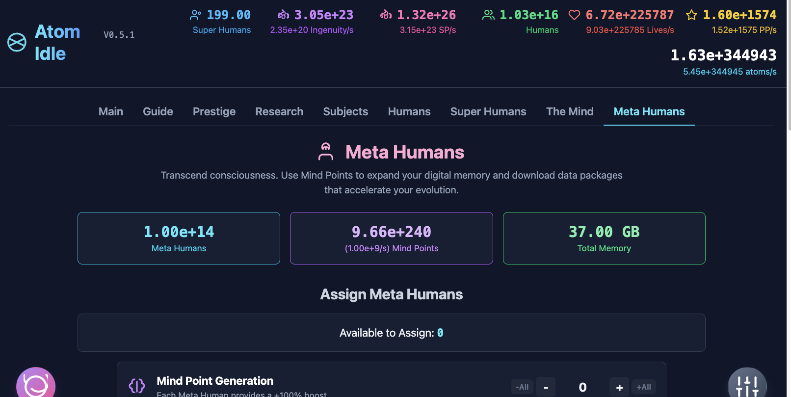 Hello theshadowmaster, thank you for the fun game. :) short explanation: after creating a meta human (dont know exactly, it started at around ~30 meta humans) super humans creation only got up to 110, but i could instantly buy another two and then 1 (with humans (around 14,5 trillion and full data packages)) so i got up to 113 and let the game run to get mind levels with skills (and keep ingenuity gain high (3,6m/s)). today i came back to infuse with some more sx XP for mind but i had the negative number popup, i didnt want to waste the XP so i chose the super human option, but the popup came up again in a really short time so i chose it again but now my atoms stay frozen at 0 with 115 super humans and 37 meta human. PP and ingenuity are running fine, sp is running slowly (as i cant upgrade, with 2,26m/s). thank you again for keeping engaged with the community here :)