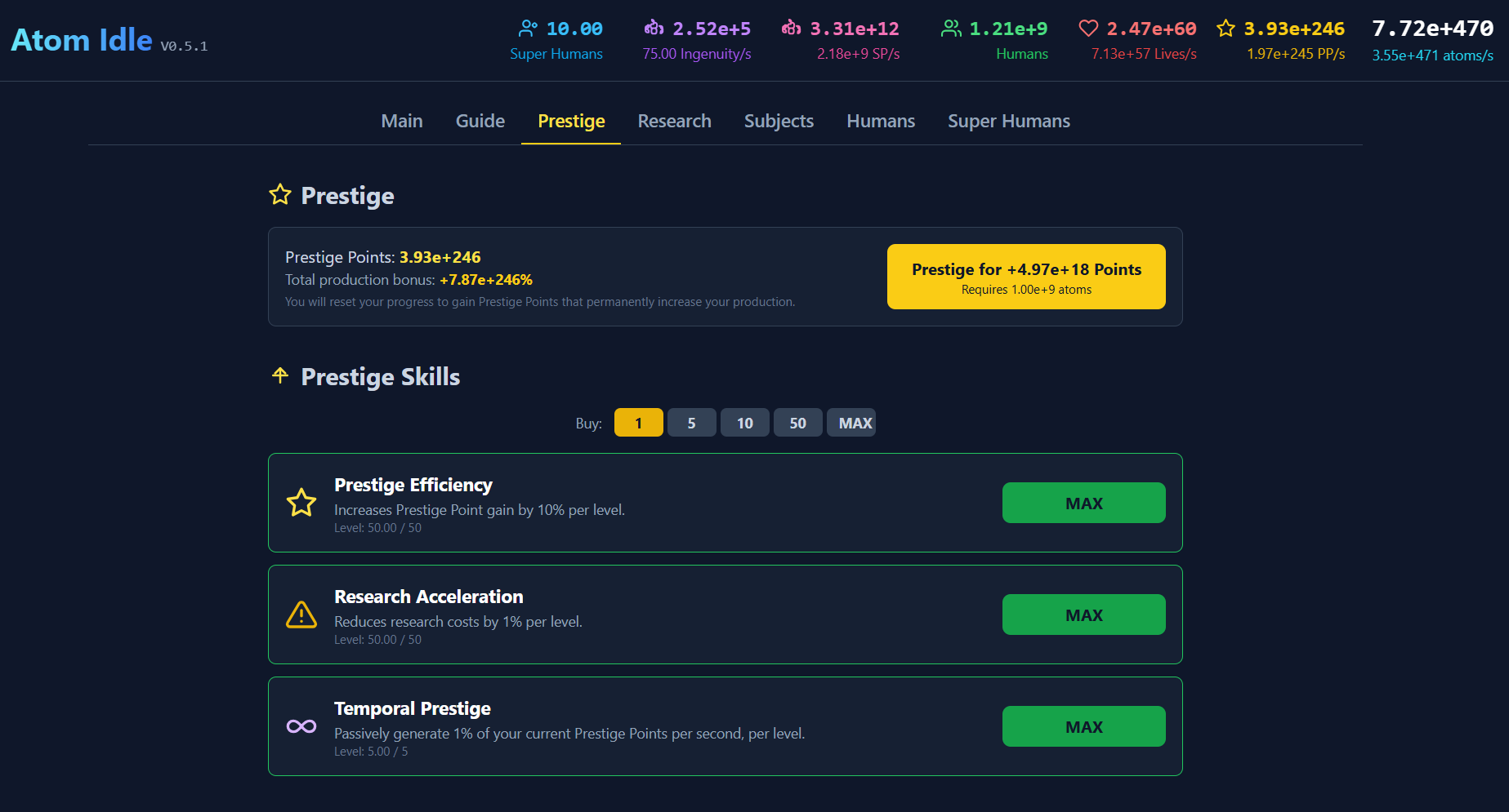 I have noticed a bug where when my prestige points would be 2.28e+118 for one prestige, it resets to 2.28e+18 and doesn't go back up. I am also unable to click on it to prestige once this bug occurs