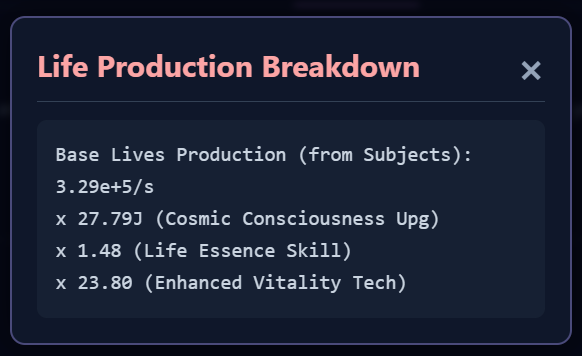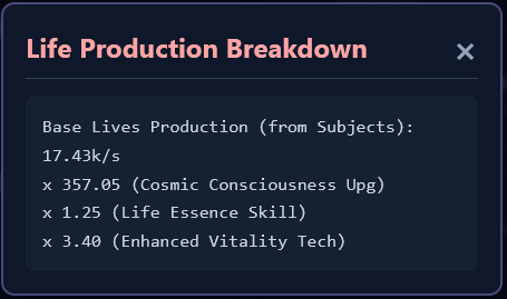 Okay, I've been taking a look to this. Some people during the launch was wondering why the lifes wasn't growing or why it was decreasing sometimes. And now that I looked into the Cosmic Consciusness, I noticed the softcapped wasn't working. Thanks a lot for telling! It will be fixed for the next update, I'll mention you when the update releases :D