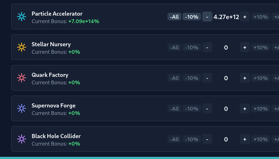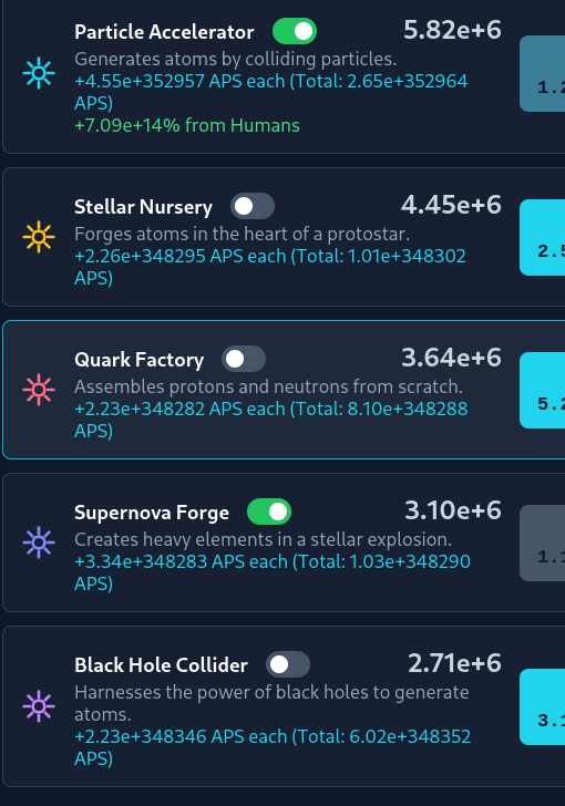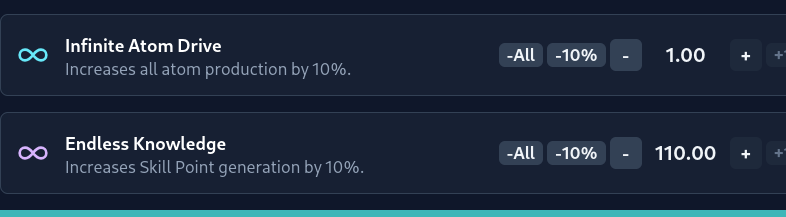 The Universe upgrades don't even really do anything... 500x atoms or whatever is a drop in the bucket at this stage in the game and getting 10k T2 atom buildings is impossible.